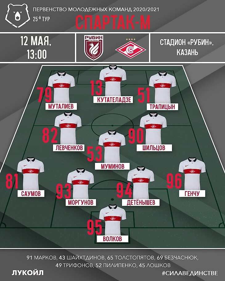 «Спартак»: Волков, Генчу (Безчаснюк, 65), Детёнышев, Моргунов (к) (Толстопятов, 46), Саумов (Шайхтдинов, 84), Муминов, Левченков, Шильцов, Трапицын (Трифонов, 84), Муталиев, Кутателадзе (Пилипенко, 77).