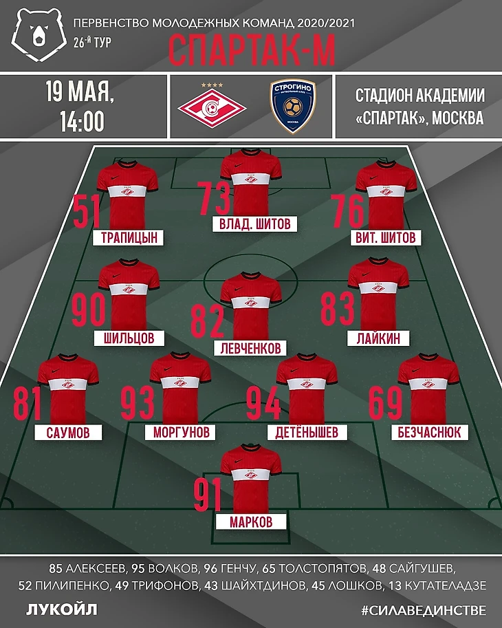 Состав. Константин Шильцов и группа игроков 2003 года рождения (Илья Детёнышев, Максим Лайкин и братья Шитовы) на концовку сезона отправились из «Спартака-2» в расположение дубля. Все пятеро на матч со строгинцами вышли в стартовом составе. В ворота вернулся Даниил Марков, в предыдущем матче в Казани первым номером был Михаил Волков. Отметим также, что игру из-за перебора карточек пропускал Аслан Муталиев.