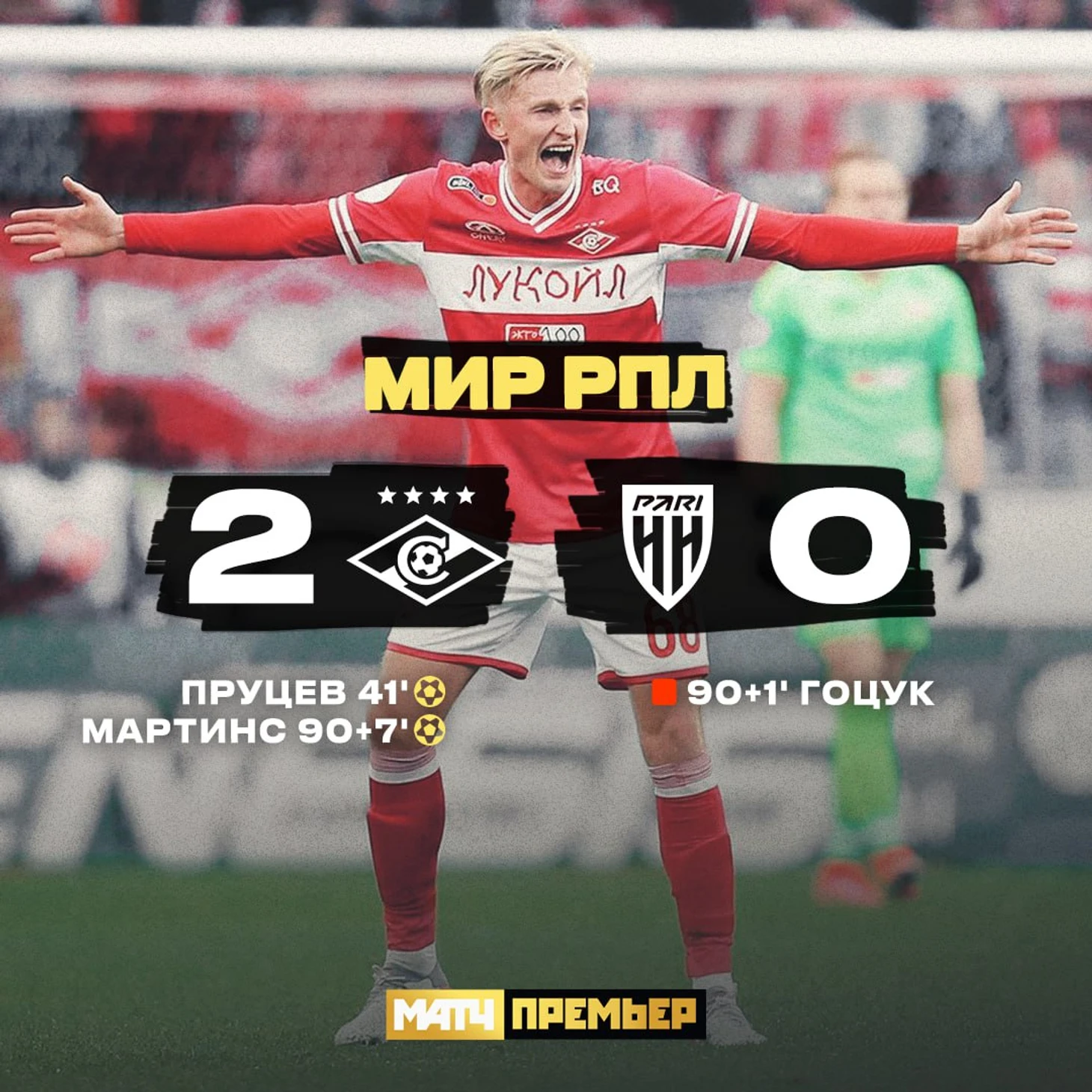 Защитник «Пари НН» Кирилл Гоцук на 90+1-й минуте получил вторую желтую карточку и оставил свою команду в меньшинстве. На 90+7-й минуте полузащитник московской команды Кристофер Мартинс удвоил преимущество красно-белых.