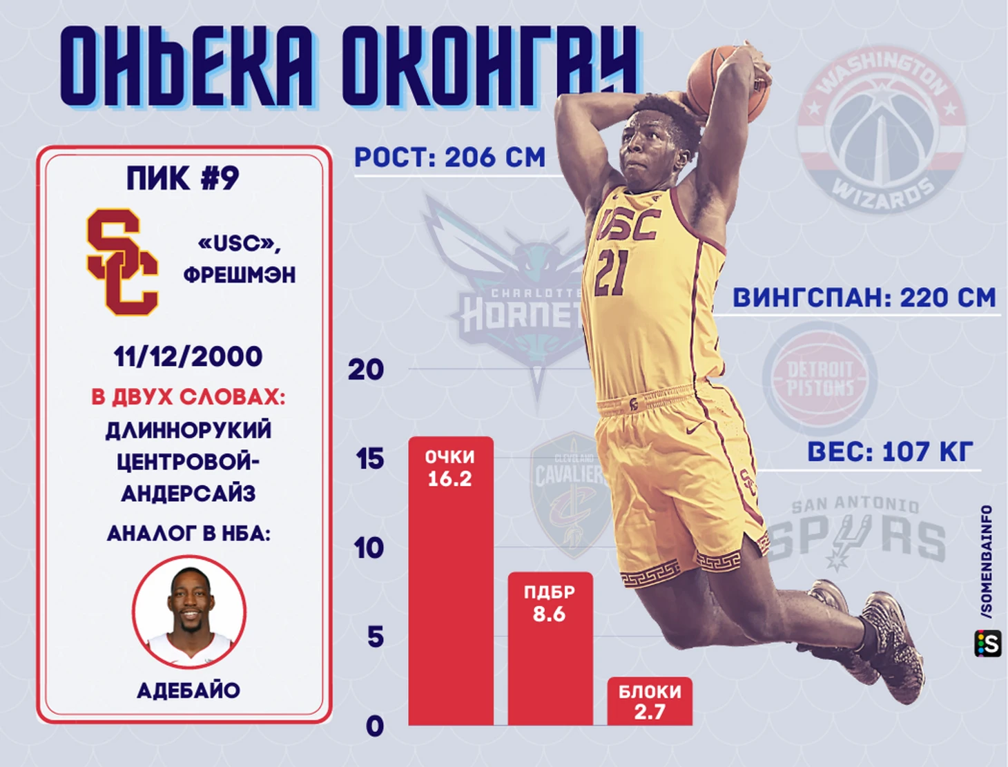 Оньека Оконгву — современный центровой-андерсайз, настоящий универсал. Аналог Дрэймонда Грина и Бэма Адебайо, он еще больше укрепил свои позиции ввиду успешного выступления «Майами» в плей-офф и в некоторых моках котируется как лучший «большой» драфта, опережая самого Джеймса Уайзмена. В университет Оньека попал пятизвездочным проспектом, обратив на себя внимание в последнем школьном сезоне в «Чино Хиллс», где ранее был на подхвате у трех братьев Боллов.