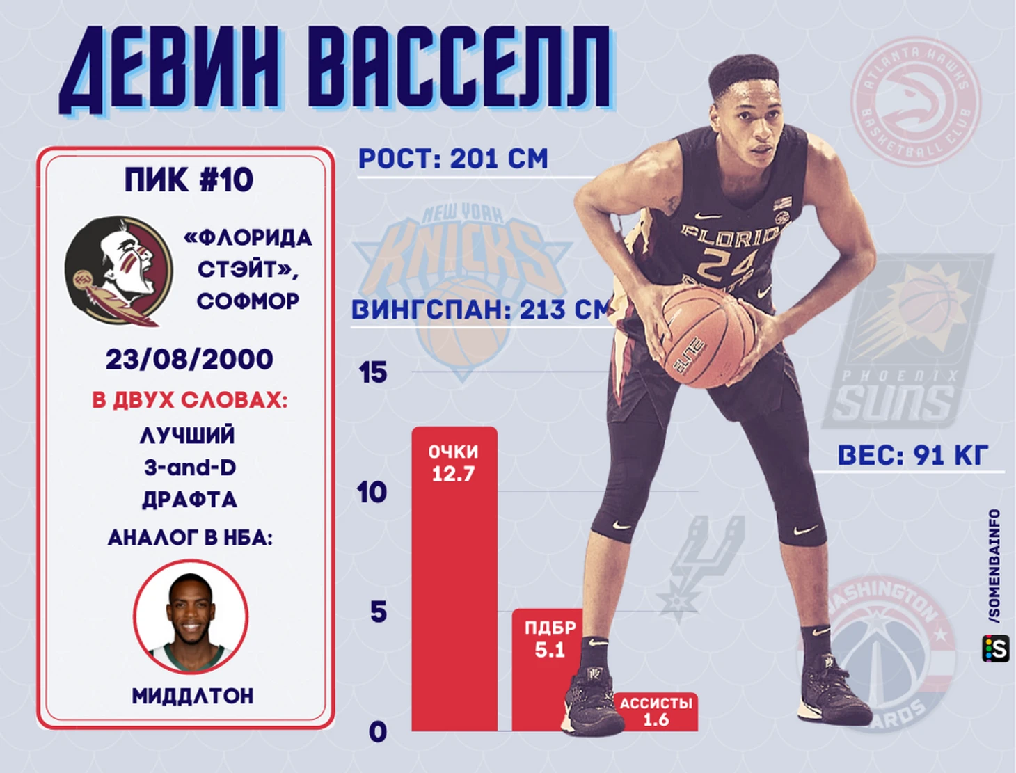 Если случится чудо, и «Хокс» предпочтут выбирать сами, они наверняка проигнорируют защитного Окоро и выберут Девина Вассела, который гораздо лучше вписывается в аналог «Уорриорс», строящийся Трэвисом Шленком в «Атланте».