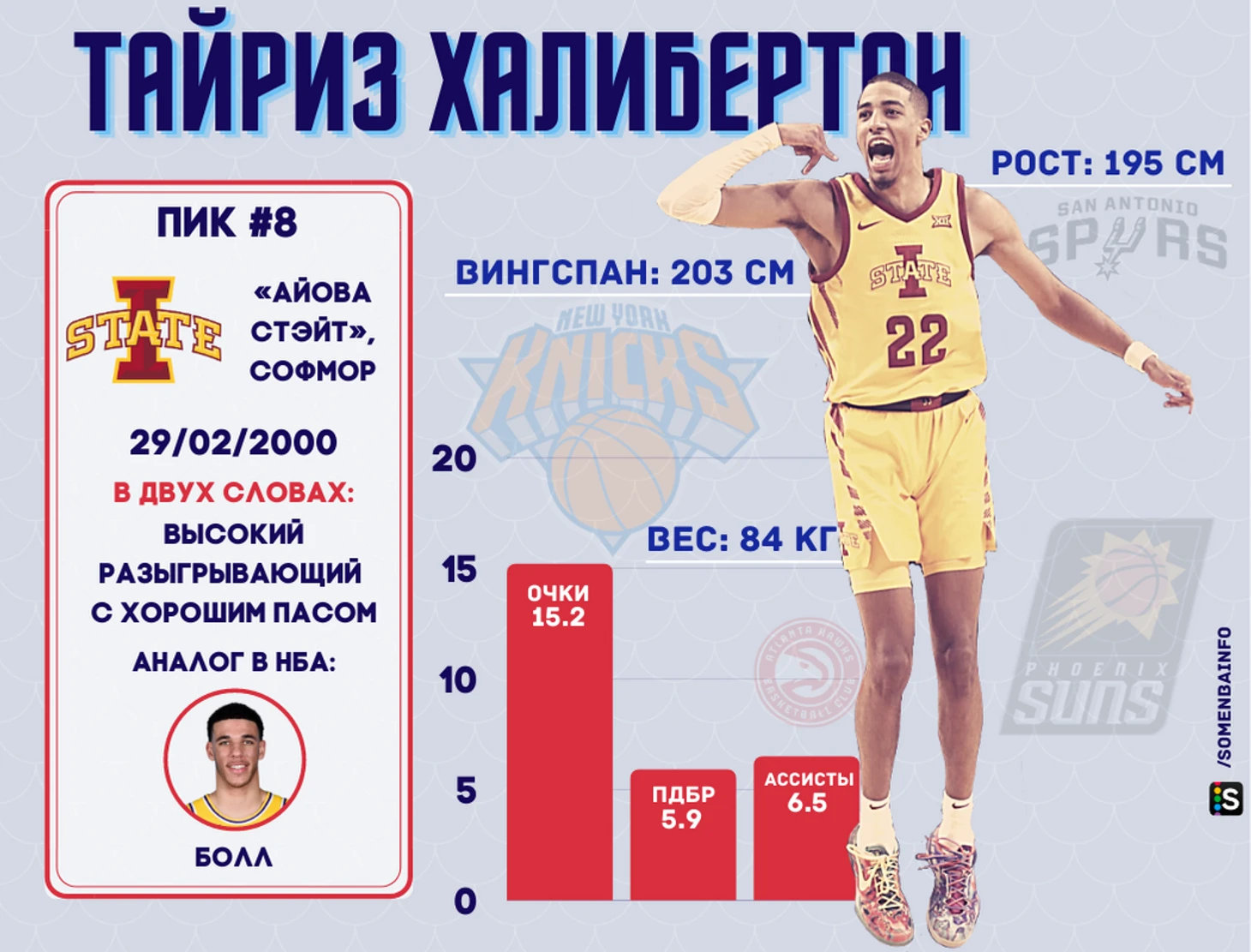 В теории Тайриз Халибертон мог бы подойти «Атланте», если она все же сохранит шестой пик — коллектив ищет запасного разыгрывающего вместо Тига, и это довольно выгодный вариант, чтобы прикрыть Трэя Янга в защите. Однако в нашем рейтинге «Хокс» берут себе более опытного игрока путем обмена, поэтому Халибертон падает ниже.