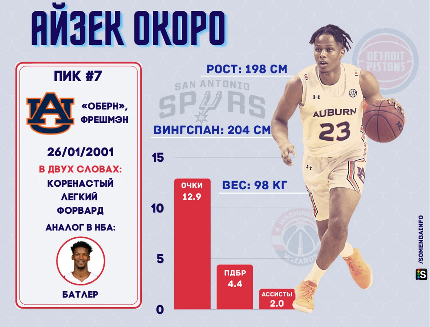 У Окоро есть единственная, но очень серьезная проблема: Айзек не играет без мяча. У него нет ни дальнего, ни среднего, и все, чем он может помочь, это заслоны и бесконечные открывания внутрь. Форвард мажет заработанные штрафные (67,2%), с игры бросает меньше Эдвардса и из гораздо более адекватных положений — в «Оберне» все создают за него — и он все равно забивает скромные 28,5% из-за дуги. Смогут ли его бросок исправить в НБА — большой вопрос: есть риск получить нового Стэнли Джонсона.