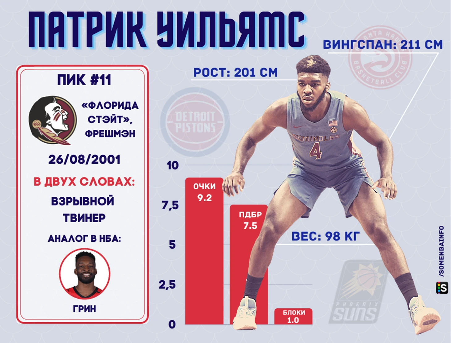 Уильямсом активно интересуется «Детройт». Выбор его под седьмым пиком выглядит несколько странно — эксперты не ставят Патрика выше десятого. «Пистонс» есть смысл опуститься на несколько позиций вниз и получить за свою уступку какой-нибудь ценный барыш в виде пика. Или не мудрить и взять Киллиана Хэйса, который им тоже пригодится и которого они тоже просматривали. В первой части нашего материала так и случилось, поэтому вариант с Уильямсом в «Детройте» запишем карандашом.
