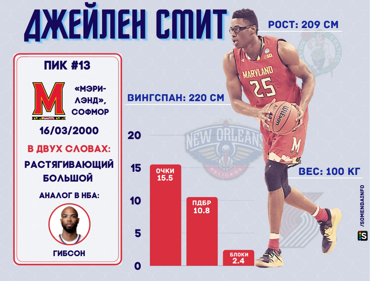 Второгодку Джейлена Смита скауты ведут давно — форвард был школьником из топ-20, участвовал в турнирах McDonald’s All-American и Jordan Brand Classic. Дебютный сезон в колледже провел блекло, раскрылся во второй и, превратившись в лидера «Мэрилэнда», выставился на драфт.