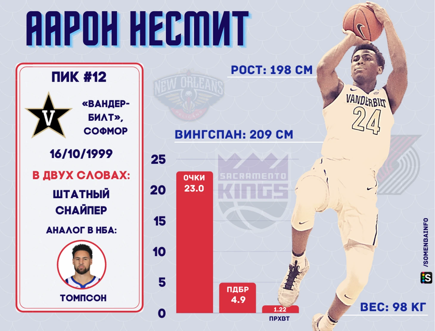 Пик Несмита был бы в стиле «Сакраменто»: они обычно выбирают либо очередного бигмена, либо вот такого вот заслуженного университетского шутера. Тем более, что Бадди Хилд, желающий более заметной роли, похоже, уже одной ногой на выходе.