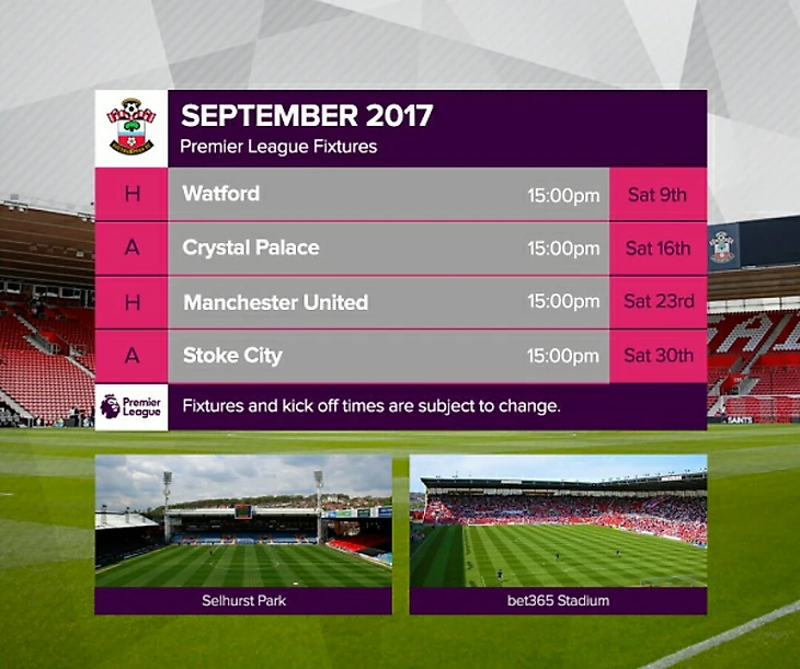 Стартуем 12 августа домашним матчем против Суонси. В августе Святые сыграют еще 2 матча: против Вест Хэма и новичка АПЛ Хаддерсфилда (оба в гостях).