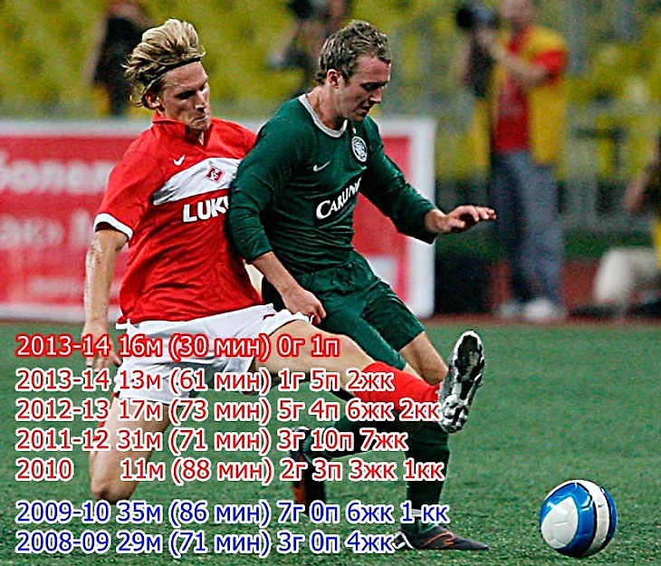 (Сезон - количество матчей, в среднем минут, голы, передачи, желтые карточки, красные карточки)