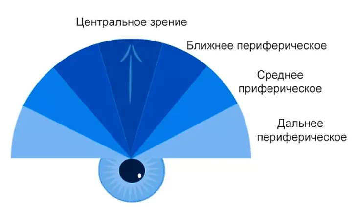 Выше показана картинка, как мы смотрим в мир. Максимально четкие детали глаз видит конечно в секторе - центральное зрение. Однако на поле не нужно читать надписи на футболках партнеров. А потому нормальный игрок легко может смотреть на картину вокруг, используя минимум - ближне-периферийное зрение, а в идеале - средне-периферийное.