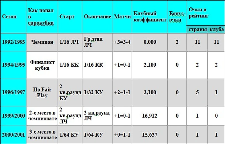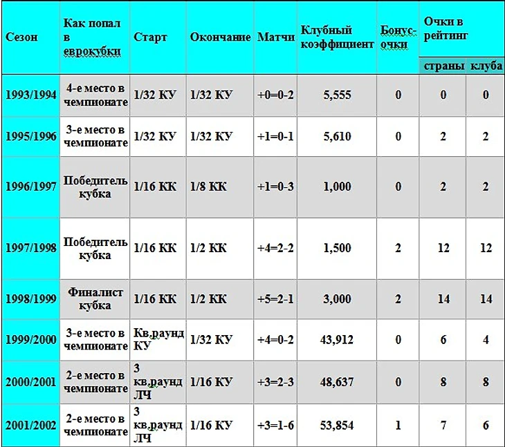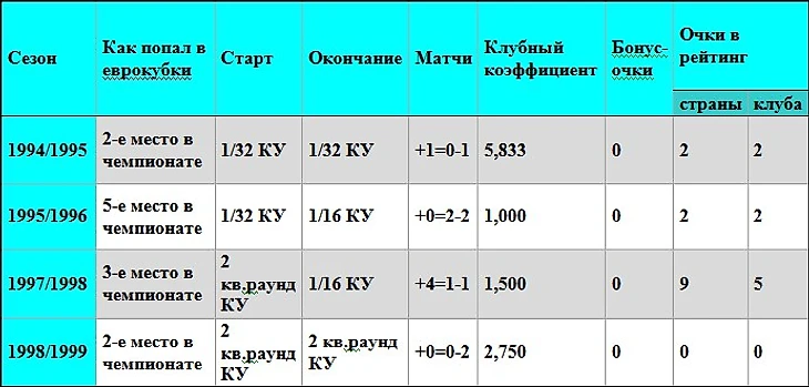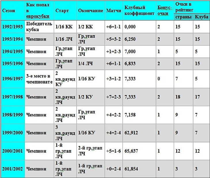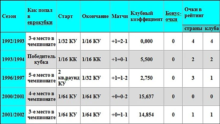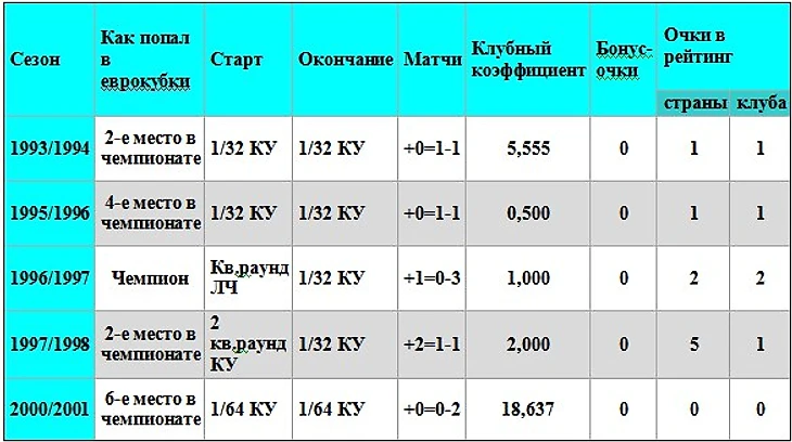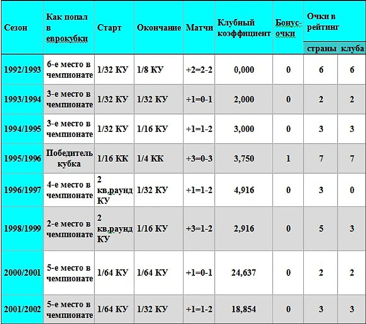 Стоит отметить, что в 5 сезонах команда набирала 12 и более очков в рейтинге УЕФА. Максимальное количество было в сезоне 1997/98 – 18. Также отметим один факт: лишь один факт: лишь два раза команда не проходила в следующий этап соревнований: 1994/95 и 2001/02.