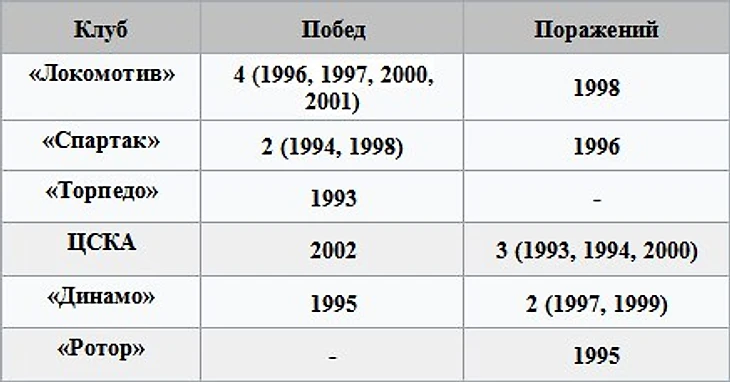 2) При этом стоит помнить, что в 1996 году проведен золотой матч между «Спартаком» и «Аланией». Он также внесен в таблицу.
