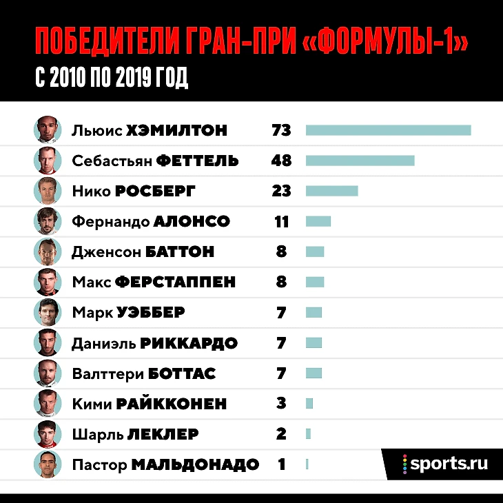 Но до 2010-х в «Формуле-1» еще не было случая, когда целое десятилетие определяли двое: Льюис Хэмилтон и Себастьян Феттель забрали 9 чемпионских титулов из 10, выиграли 121 из 198 проведенных Гран-при (61%).