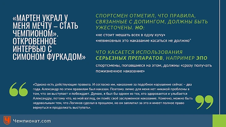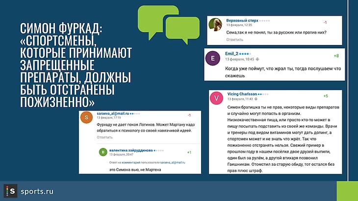 И еще один материал, который вышел уже 13 февраля, все по тому же интервью, но уже на sports.ru, со ссылкой на sport24, под заголовком: Симон Фуркад: «Спортсмены, которые принимают запрещенные препараты, должны быть отстранены пожизненно».