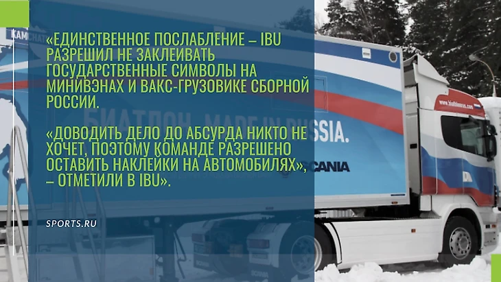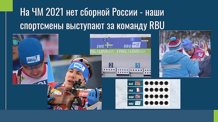 В декабре 2020 CAS (Спортивный арбитражный суд в Лозанне) установил срок наказания 2 года для России, поэтому на прошедшем Чемпионате Мира наши спортсмены выступали без национального флага и гимна. Команде России была запрещена всякая российская символика и даже публикация фотографий и репосты картинок с российским флагом в соц. медиа. Поэтому на ЧМ 2021 нет сборной России - спортсмены выступают за команду RBU. Вместо российского флага - логотип Союза биатлонистов России.