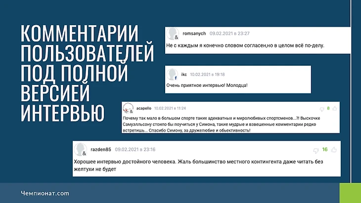 Кажется, что текст интервью изменен совсем немного и это не может повлиять на что-либо, но это не так – для подтверждения смотрим на комментарии уже под полной версией интервью на «Чемпионате», где точку зрения Фуркада явно поддерживают и более того – хвалят спортсмена за корректность высказываний.