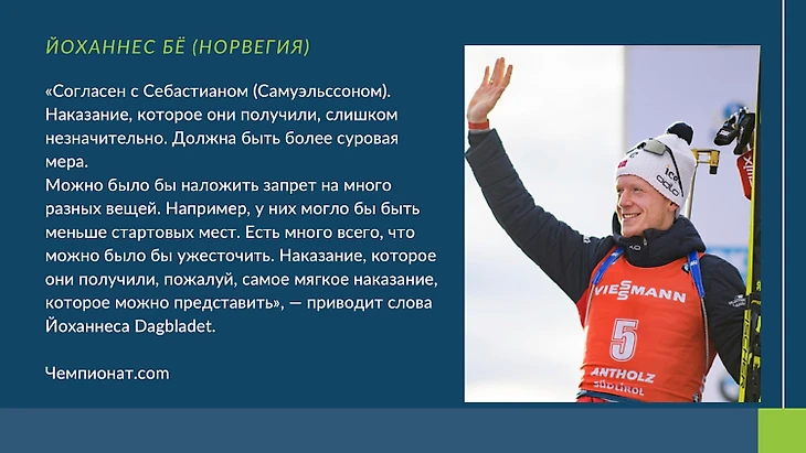 Газета.ru отметили, что норвежец «призвал IBU принять более строгие санкции в отношении СБР и всех российских спортсменов».