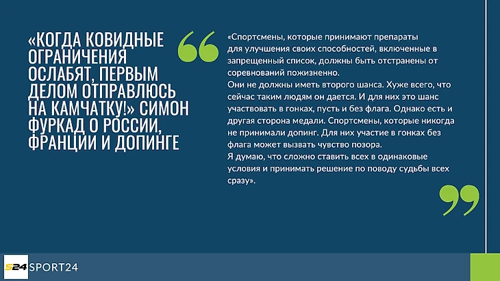 12 февраля уже на Sport24 выходит сокращенная версия того же интервью Симона Фуркада - «Когда ковидные ограничения ослабят, первым делом отправлюсь на Камчатку!» Симон Фуркад о России, Франции и допинге».