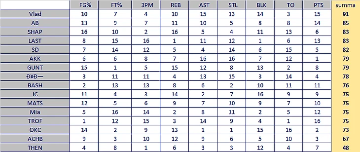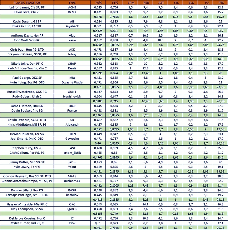 Отметим, пребывание на дне Гавроша (как можно закипать ДеРозу и Процесса, а скинуть Кембу?!), лидирование идеальной пары большой+малыш (Дэвис-Уолл), ну и ГМ-чиков затащивших по две каты: Johny Kharichev c Полом и Дреймондом, и Денис Шаповалов с двумя ультрасовременными башнями Таунс-Йокич. Сортировка по сумме, в большей степени, была сделана для наглядности и не претендует на какой-то абсолютный показатель, но каждый, думаю, может извлечь из него что-то полезное для себя.