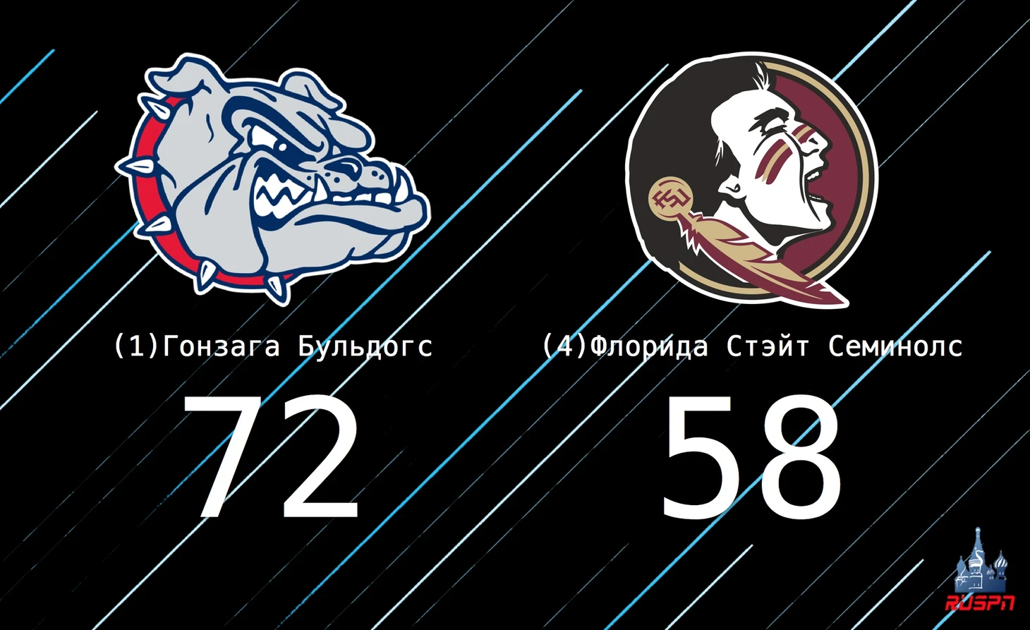 Первый матч, за которым я слежу: (1) «Гонзага Бульдогс» – (4) «Флорида Стэйт Семинолс». В первом туре против «Вермонта» я сказал, что игра во многом зависела от «Флориды Стэйт» и от их стремления победить. Ведь в прошлом году «Флорида Стэйт» дошла до раунда великолепной восьмерки, и была в 4-х очках от последней четверки. 8 игроков с прошлогодней команды выступают за «Флориду Стэйт» и в этом году. Плюс эта команда вынесла фаворита турнира АСС «Вирджинию» в полуфинале турнира.