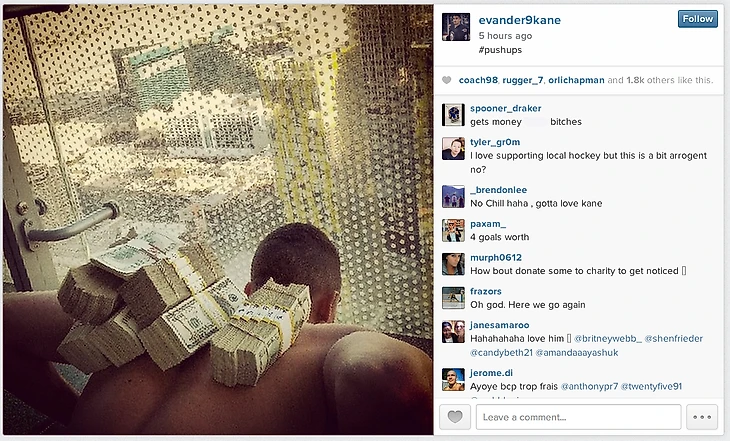 Первый скандал с участием Кейна случился в локаутный сезон 2012-13. Пока все игроки переживали из-за отсутствия хоккея, Эвандер фотографировался в свои соцсети с пачками долларов в руках, а потом и вовсе отжимался с деньгами на спине. Тогда это вызвало волну возмущения, и Кейн удалил фотографии. В тот год игрок заработал 3 миллиона долларов, а уже в 2015-м его зарплата составила 6 миллионов «зеленых». Если взглянуть на Инстаграм Кейна, становится ясно – парень очень любит деньги и роскошь. Машины на любой вкус: Бентли, Феррари, Ламборгини, Роллс-Ройс; частные самолеты, дорогие рестораны и одежда, люксовые курорты, драгоценности, тусовки, и на особо много хоккея. При этом уровень игры Кейна со времен получения жирного контракт существенно снизился. Особенно натерпелись с ним в «Баффало», когда получая 6 миллионов долларов, Кейн не всегда добирался и до 40 очков за сезон. В НХЛ все возмущались, что Эвандер – слишком переоцененный хоккеист, однако в 2018 году появляется «Сан-Хосе» и кладёт Кейну новые рекордные деньги – 49 миллионов долларов за 7 лет. В первый год Эвандер получил 9 миллионов: это истинный подарок для такого любителя роскоши, который лишь усугубил положение дел Кейна.