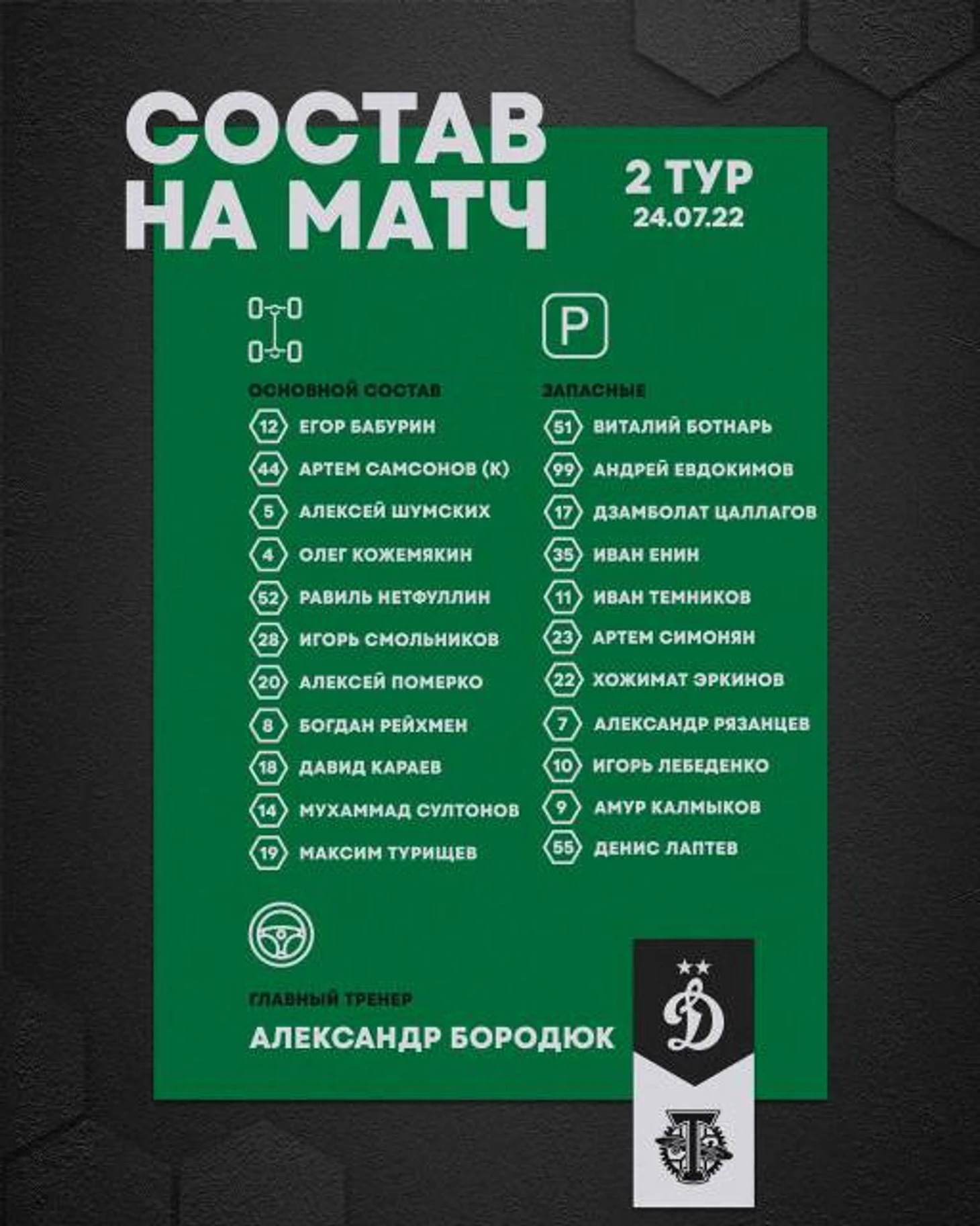 Состав на матч с «Динамо» предстал схемой 5-2-2-1.
