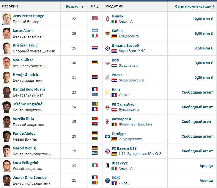Летом «Айнтрахт» покинул многолетний лидер команды «десятка» латераль Филип Костич. Серб определял игру клуба: он активно участвовал в прессинге, отрабатывал в обороне, отдавал ключевые и голевые пасы, а когда у «орлов» не шла игра, Костич начинал подавать в штрафную, что создавало опасность у ворот соперника. После победы в Лиге Европы с «орлами» и внушительными 7+14 по системе гол + пас во всех турнирах «десятка» немцев ушла в «Ювентус», а «орлы» подписали целых 10 новичков.