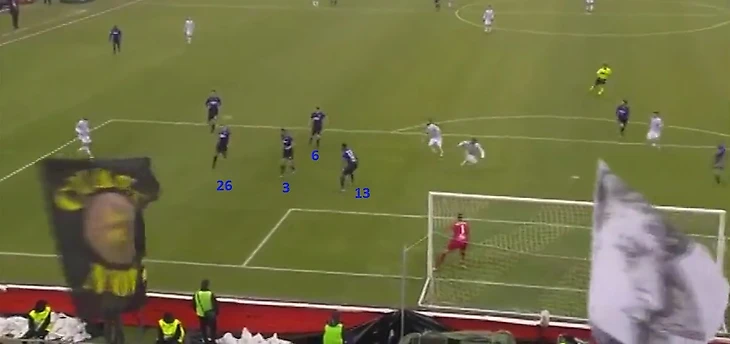 Оборона – головная боль Симоне Индзаги. Картинка ниже: 35’, феррарцы проигрывают 2-3, центральные защитники бьянкочелести дружно оставляют зону перед воротами.