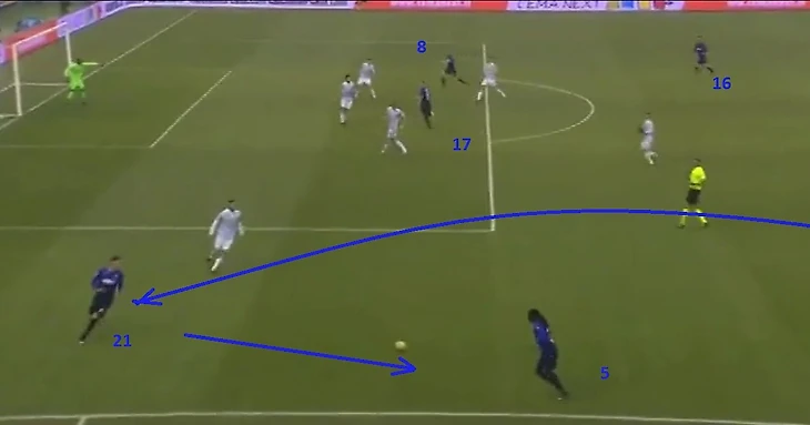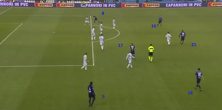 Появление Лукаку в старте сильно ослабило защиту, все предголевые и опасные подачи в первом тайме шли из его зоны. Прессинг хозяев на 30' приводит к тому, что Джордан высоко поднимается по своему флангу – обрез. И уже Иммобиле пытался догнать Ладзари в позиции левого защитника, перед вторым голом Антенуччи.