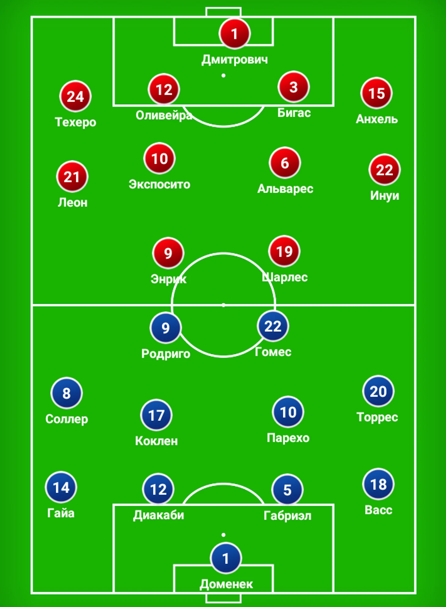 «Валенсия» играла по привычной схеме с активными флангами и двойкой отличных нападающих Гомес – Родриго, в оборонительных порядках стоит отметить отсутствие Гарая (аргентинец весь матч провел на скамейке запасных) и травмированного голкипера Силлиссена, которого заменил Доменек, наш Денис Черышев появился на поле в самой концовке и успел запомниться успешным дриблингом против двух соперников. В связи с большим количеством травмированных игроков главный тренер гостей Мендилибар выставил состав близкий к идеальному, с активными крайними полузащитниками Инуи и Педро Леоном.