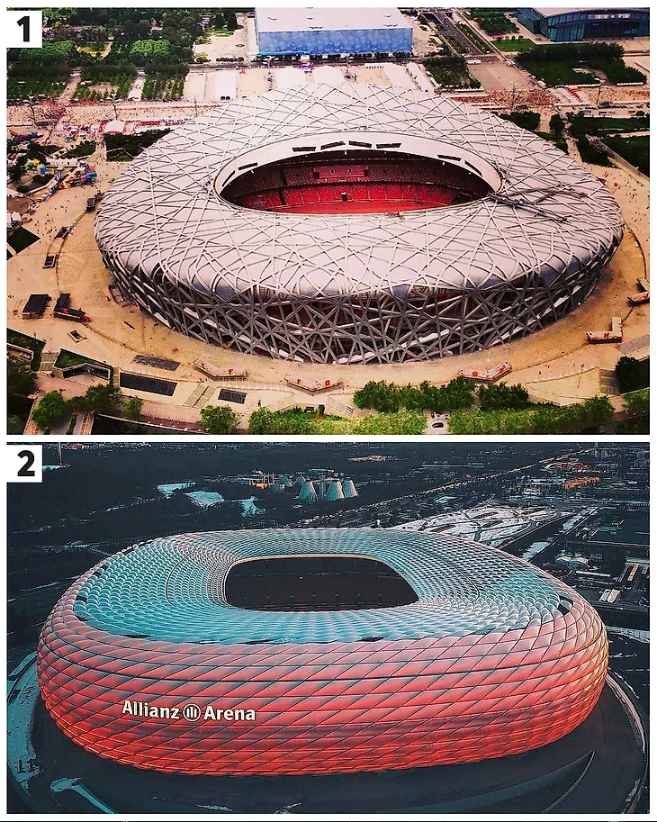 Проект стадиона был разработан швейцарским архитектурным бюро «Херцог и де Мёрон». Они же разрабатывали проекты Пекинского Национального стадиона (изображение 1) и немецкой «Альянц Арены» (изображение 2).