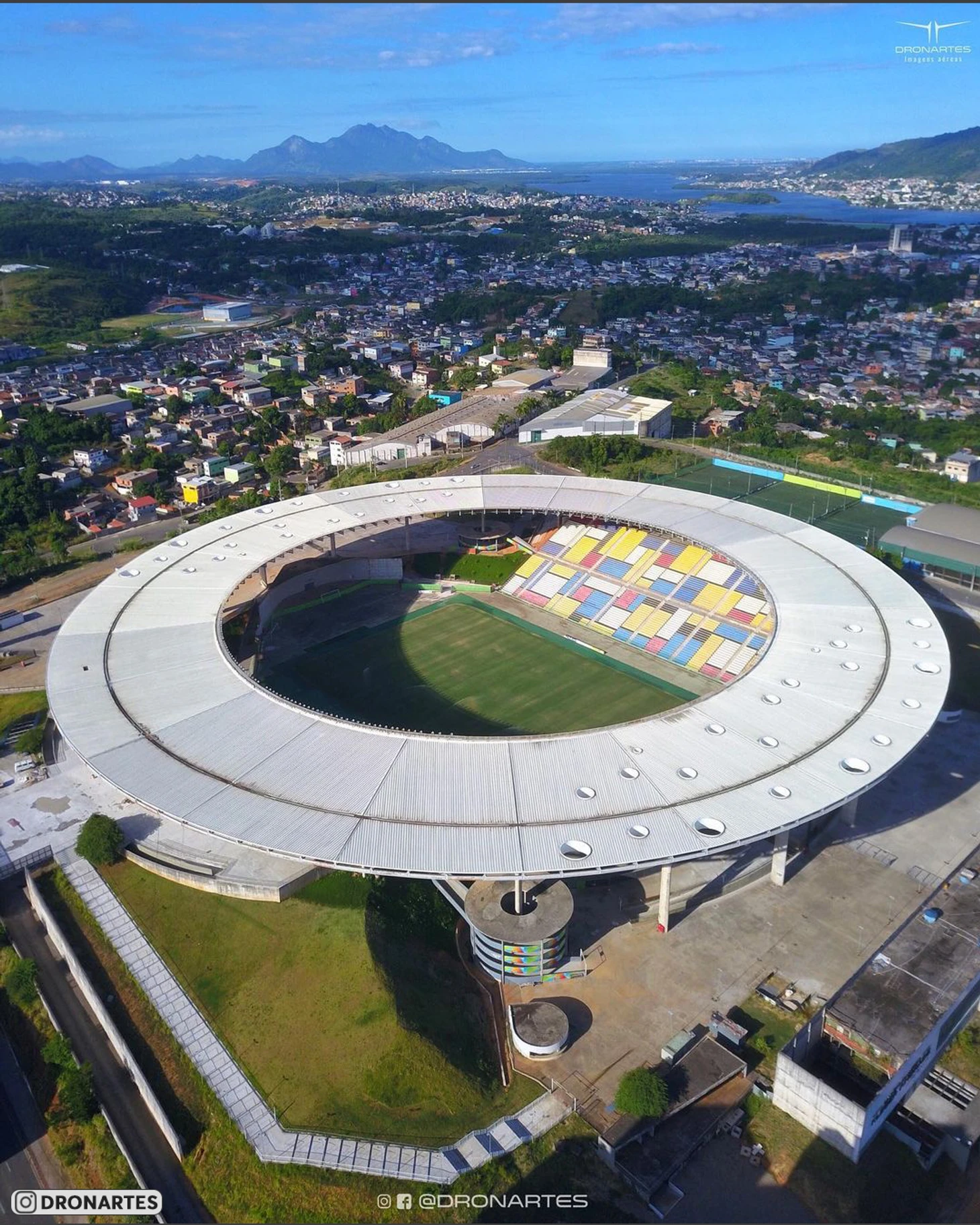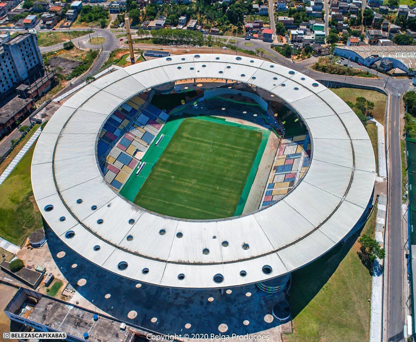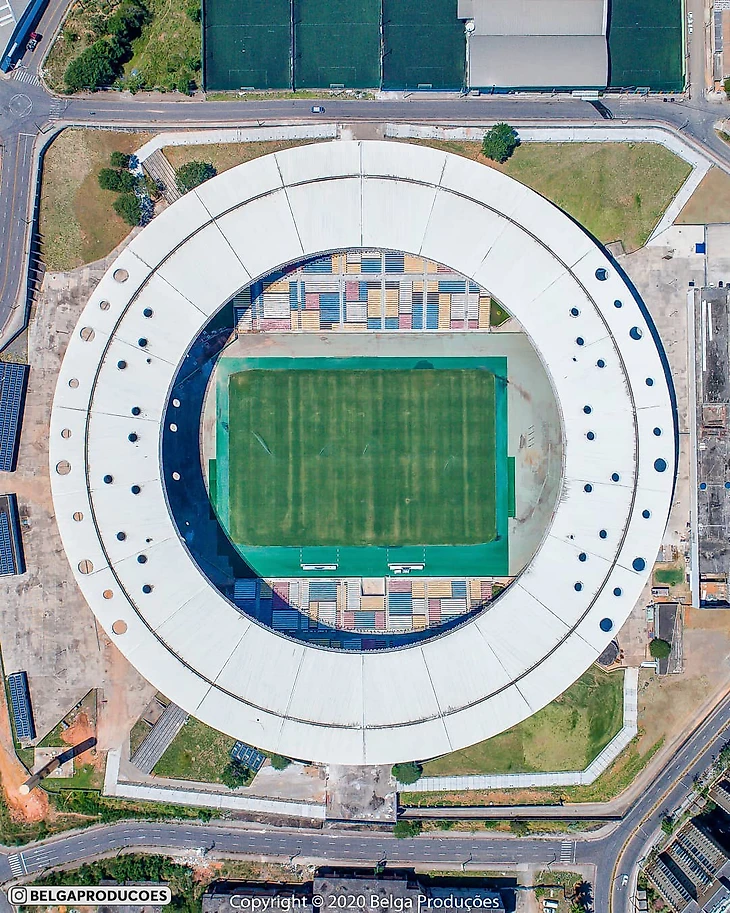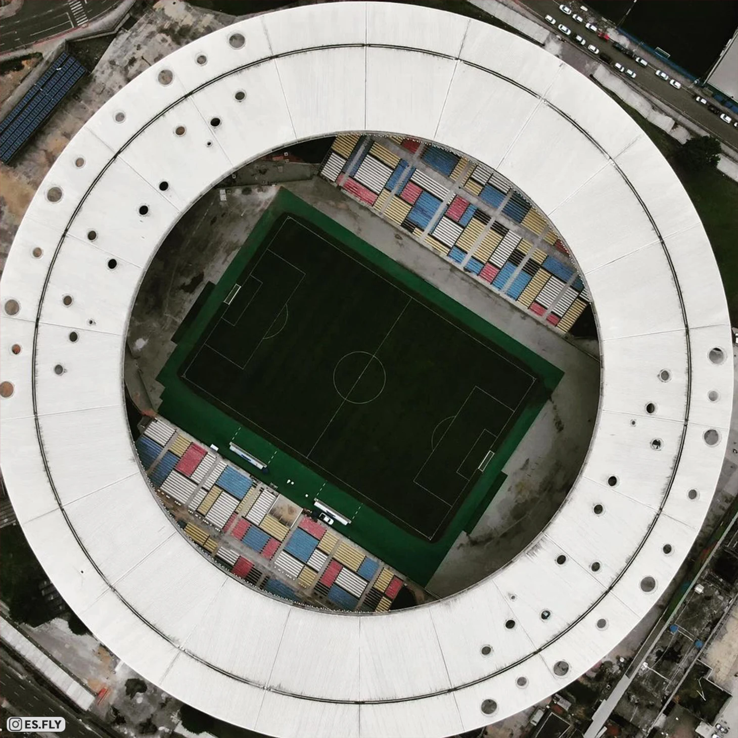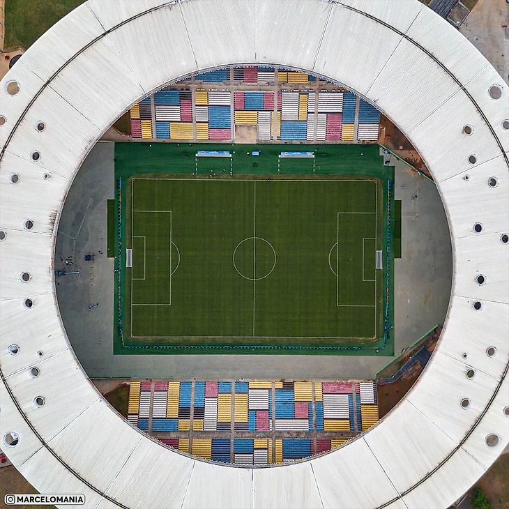 Стадион «Клебер Жозе де Андраде» имеет крайне необычный дизайн. Разноцветные трибуны и отверстия в крыше (фото с дронов)