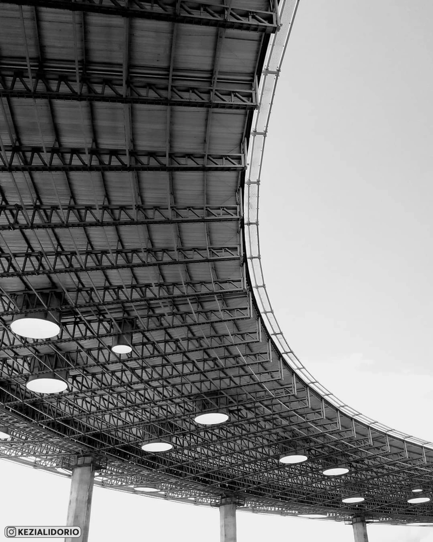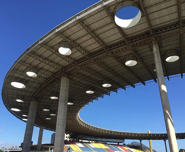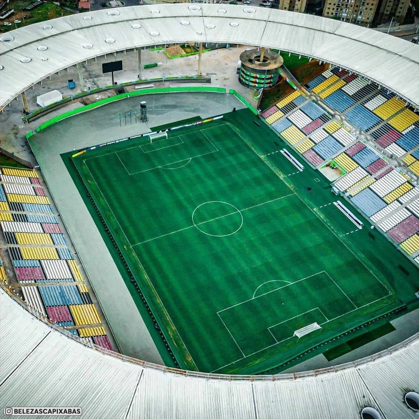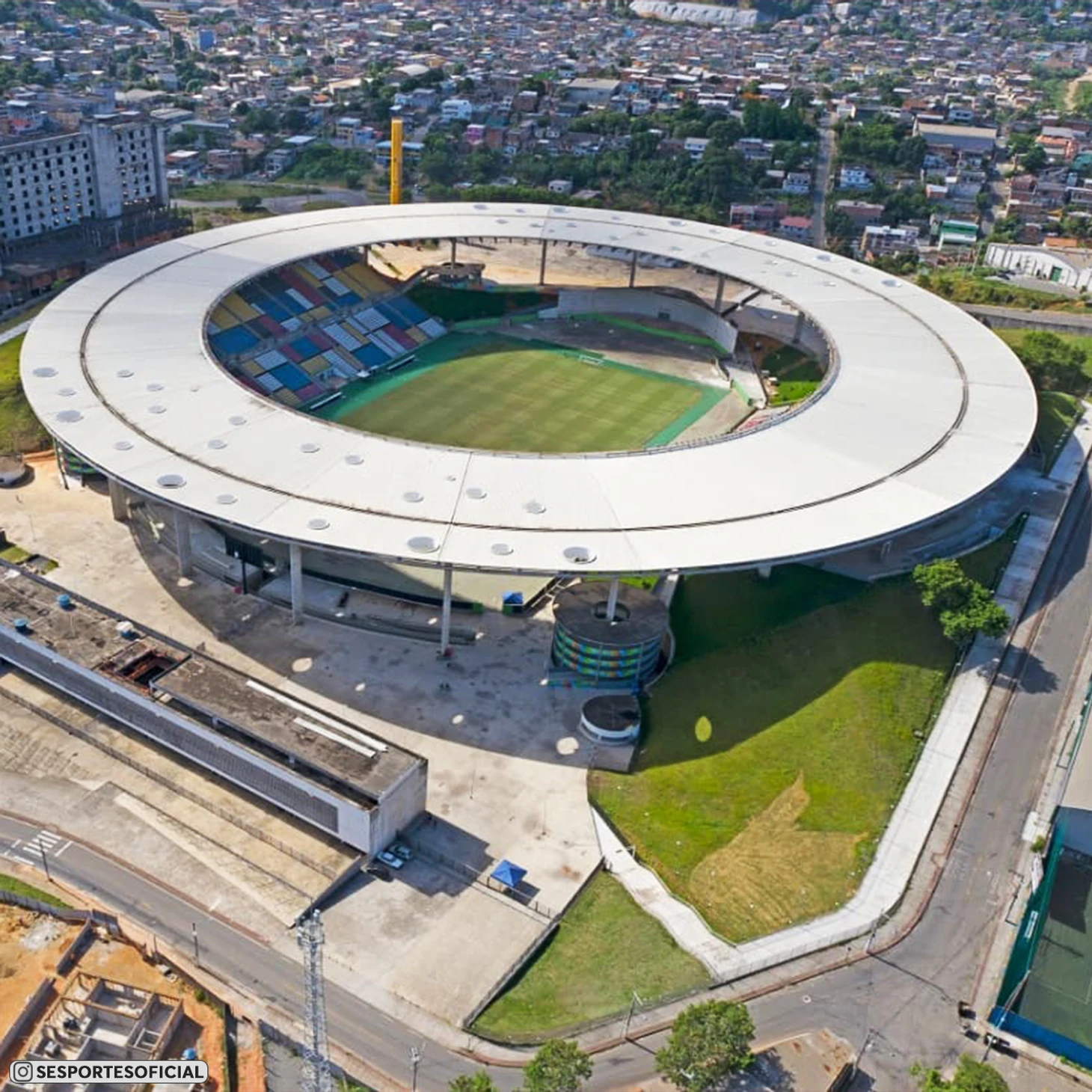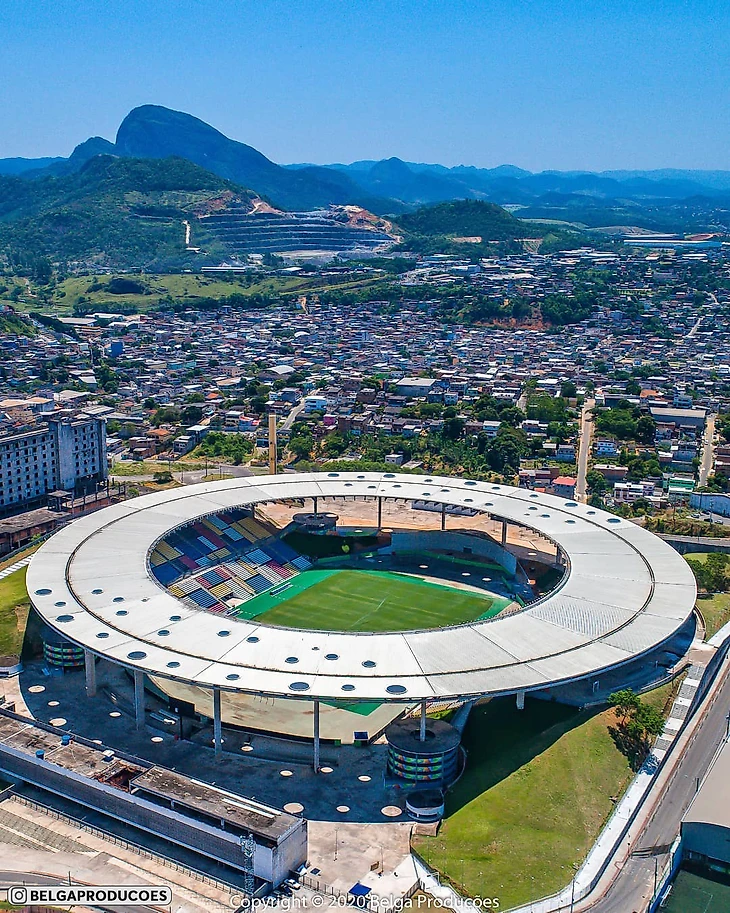 Стадион «Клебер Жозе де Андраде» имеет крайне необычный дизайн. Разноцветные трибуны и отверстия в крыше (фото с дронов)