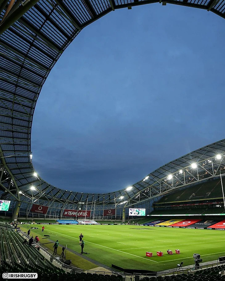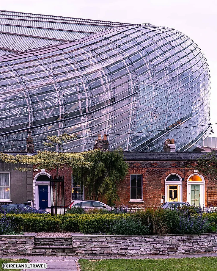 Это стадион «Авива» (Aviva Stadium), который расположен в ирландском городе Дублин. Его возведение началось в 2007 году на месте старого «Лэнсдаун Роуд», а завершилось строительство спустя три года — в мае 2010. На его создание потребовалось 410 миллионов евро. «Авива» способен вместить 51 700 зрителей.