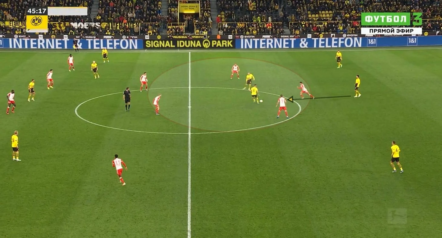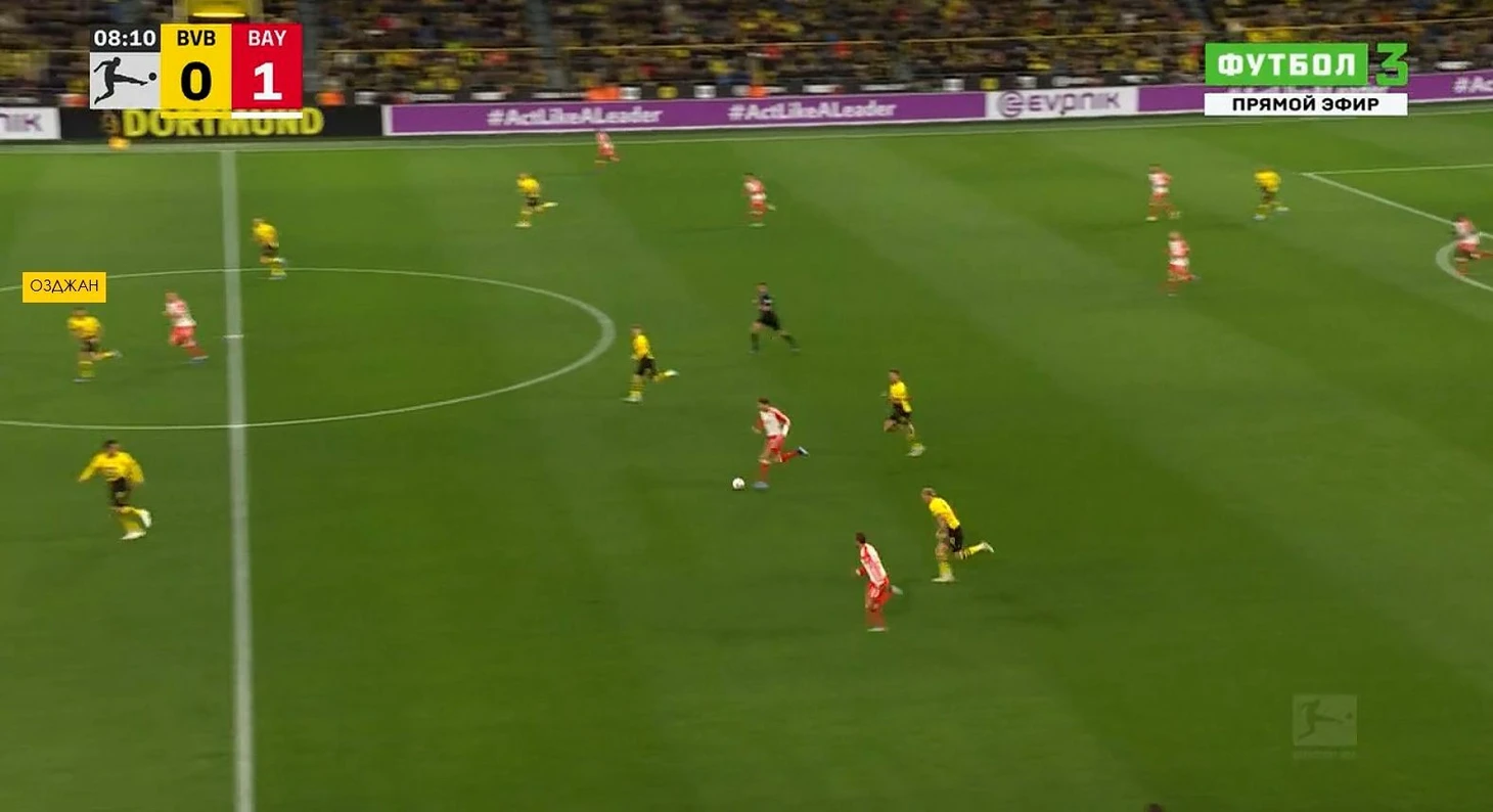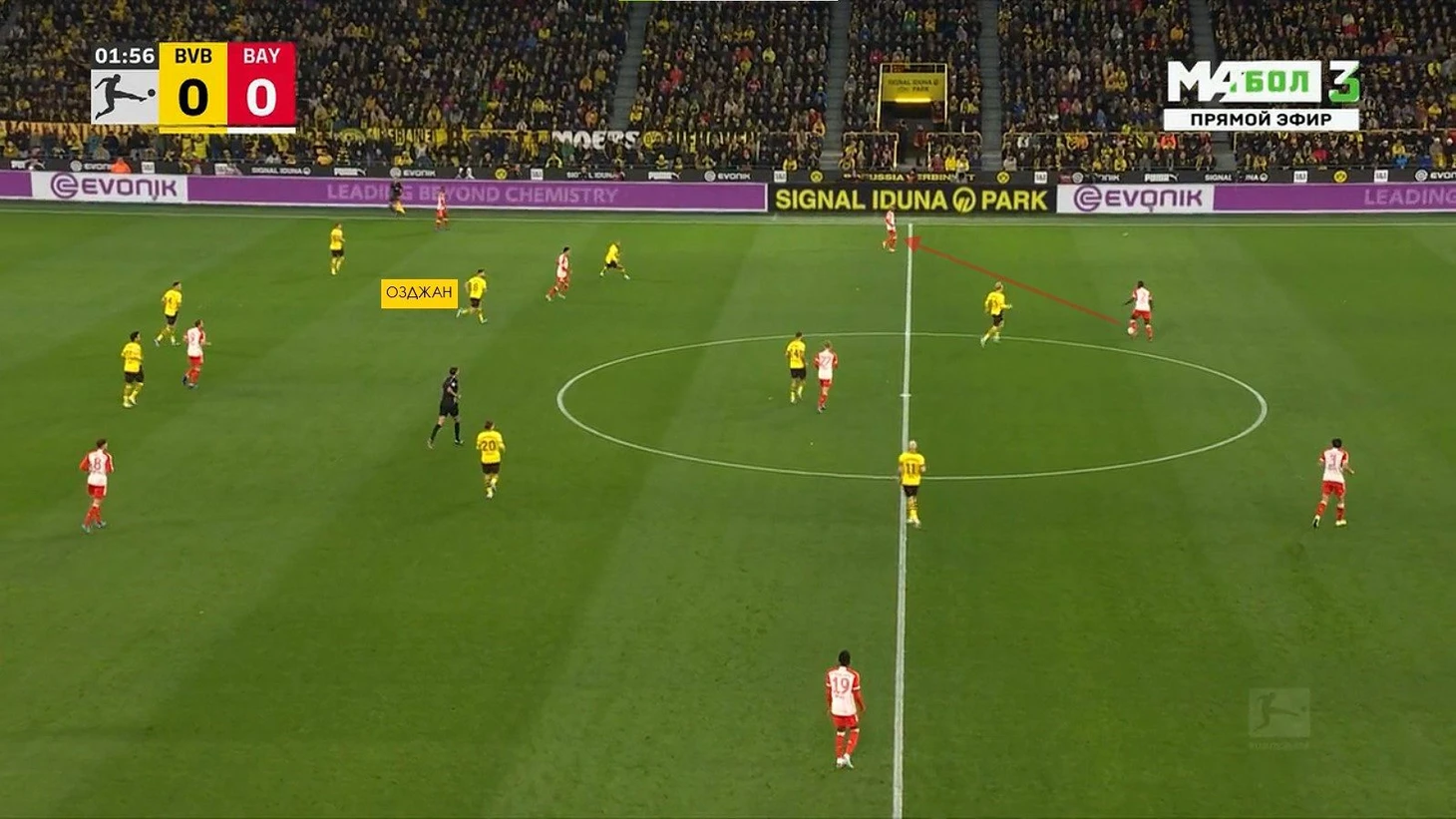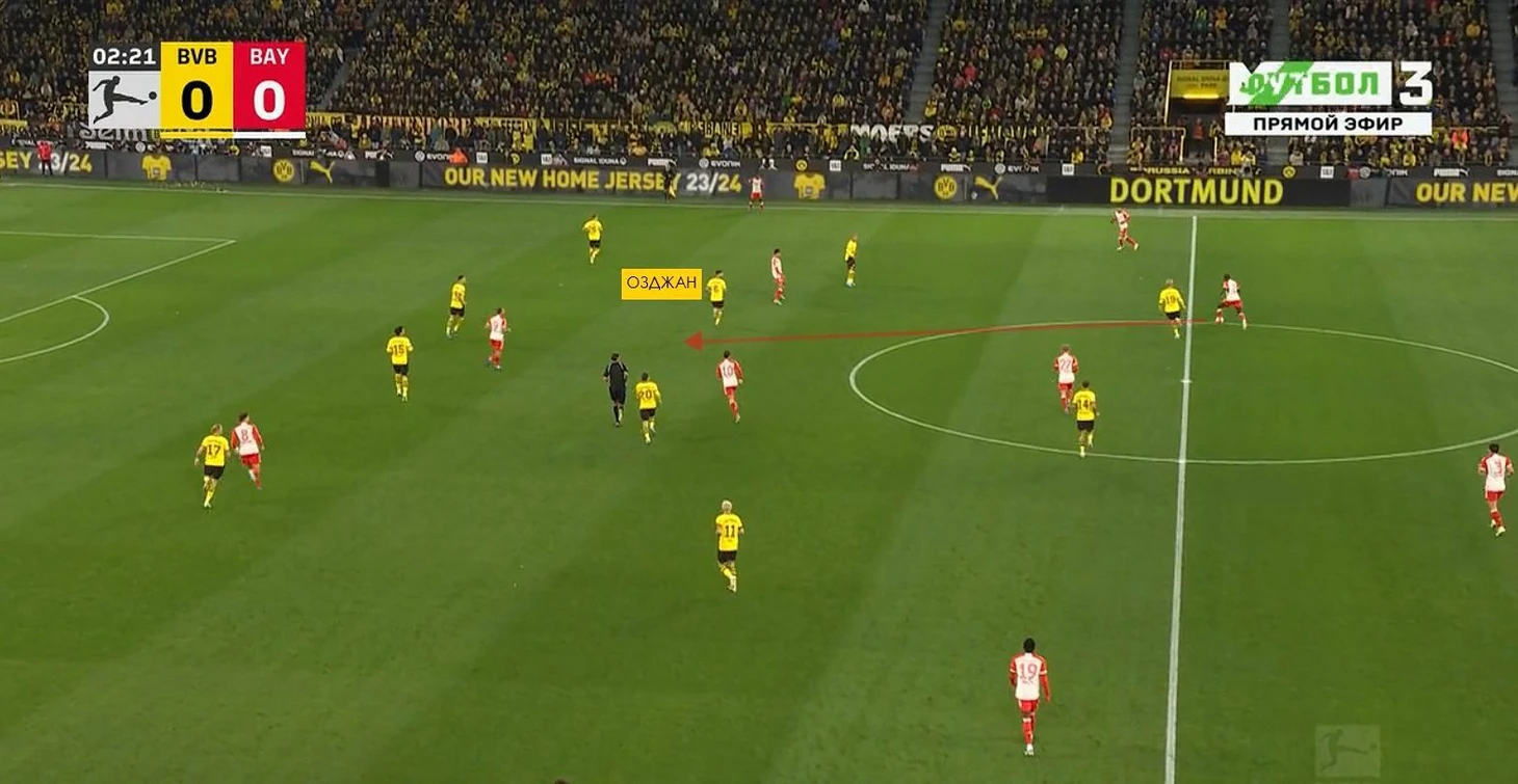 Во время затянувшегося выхода из обороны Хуммельс отдал мяч Озджану, который вместе с Забитцером находился в окружении игроков «Баварии». Не самое разумное решение Матса, однако главное тут — дальнейшее действие Озджана, который по идее при первой же возможности должен вывести мяч из круга, поскольку оставаться под давлением со всех сторон бессмысленно даже при наличии хорошей техники у игрока, есть большая вероятность потери.