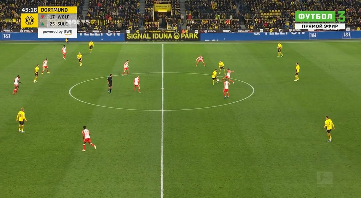 Что еще более удивительно, «Боруссия», явно приготовившись играть вторым номером, сразу уступила ментально в этом режиме. Подтверждением служит атака «Баварии» на старте встречи. Мяч попал к Упамекано возле центрального круга и он сделал передачу на правый фланг Мазрауи. Игроки дортмундской команды в позиционной обороне контролировали весь процесс и располагались так, чтобы не только видеть все, что происходит, но и иметь возможность быстро развернуться, если мяч полетит за спины защитникам.