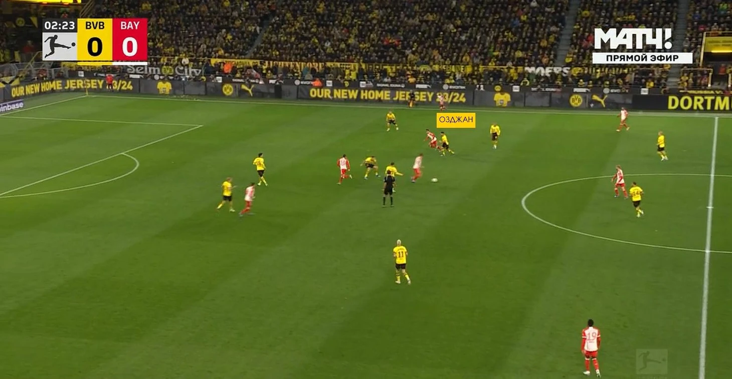 Вообще выход Озджана в Дер-Классикер стал возможен лишь по причине травмы основного оборонительного полузащитника — Эмре Джана. В центральной линии «Боруссии» этого сезона образовалась достаточно строгая иерархия: есть два полузащитника в схеме 4-2-3-1, один из них — с более атакующей ролью, которую делят Забитцер и Нмеча, другой — с более оборонительной, соответственно, Джан или Озджан. Тренер Эдин Терзич не стал отказываться от этой модели и выбрал пару Забитцер - Озджан, оставив Нмечу в запасе.
