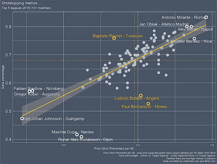 Есть также точки весьма далекие от линии тренда, их немного, и надо рассматривать отдельно, что послужило причиной того, например, почему Людовик Бутелле находится очень низко по проценту отраженных ударов в створ, но примерно в середине по "goals prevented".