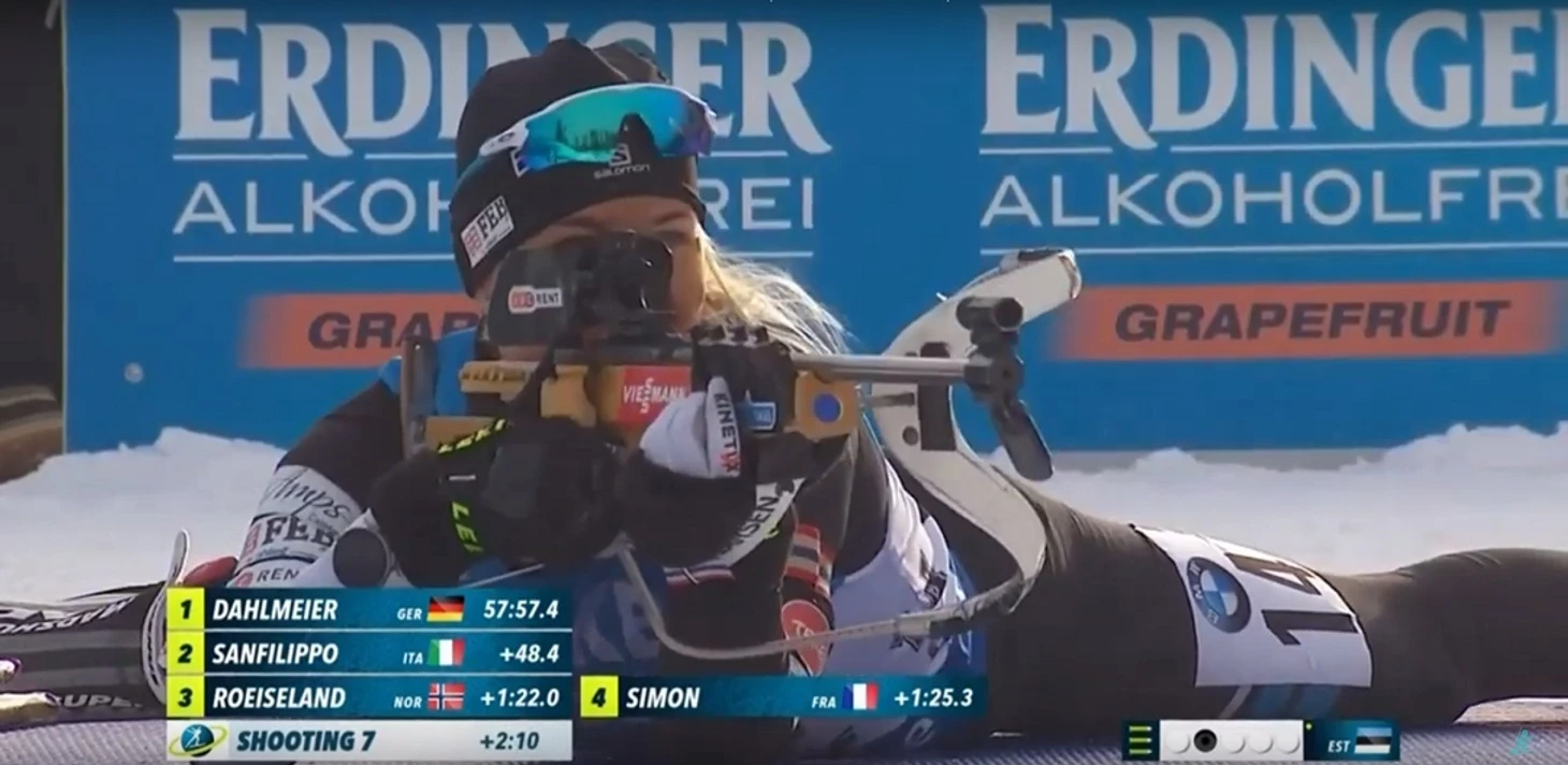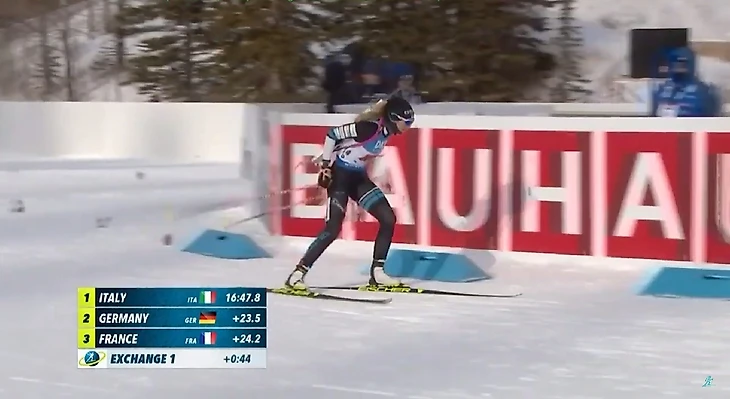Одна из красивейших биатлонисток мира Регина Оя обходит на финише этапа американку Сюзан Данкли и передаёт эстафету четвёртой.
