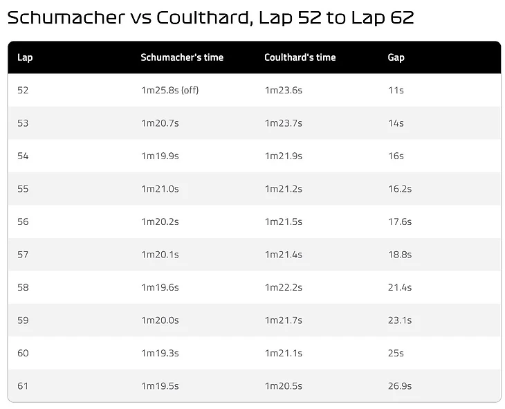 Все не так просто. Шумахер ехал в бешеном темпе. У Култхарда было на 30 кг больше топлива. В жарких условиях более мягкая резина на машине Култхарда работала так себе: «Я не мог ехать так же быстро после второго пит-стопа, как до него. Выбор резины был неверным, я вырвался на оперативный простор, но не мог ехать быстро». Шумахер круг за кругом выдавал супервремя, а Култхард не мог ехать быстрее из-за резины. Однако именно на том круге, когда гонщики «Макларена» поменялись позициями, Шумахер немного выехал за пределы трассы. Он потерял где-то 5 секунд, хотя и без повреждений. Это хотя бы частично компенсировало Култхарду время, которое он потерял за Микой. Как Шумахер нашел еще 14 секунд за 10 кругов (как оказалось, даже еще больше)? Как быстро он ехал?