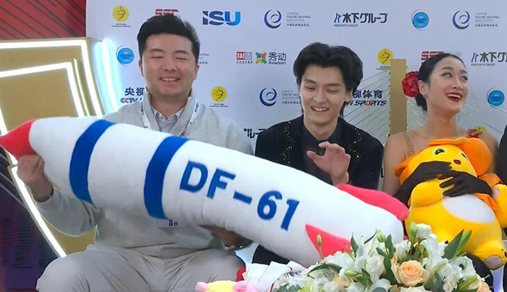 +14 25 октября, 17:10 🚀 Китайские фигуристы махали плюшевой ядерной ракетой, пока ждали оценки. Что?! 35 Новейшая разработка.