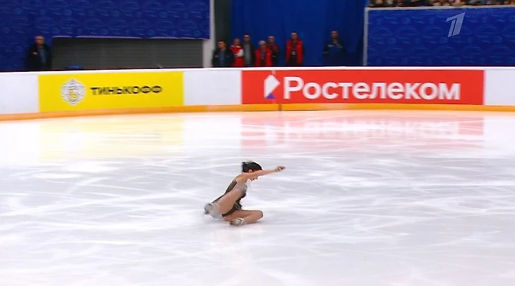 Софья Самоделкина начинает с падения с квад-риттбергера - выглядит страшновато.