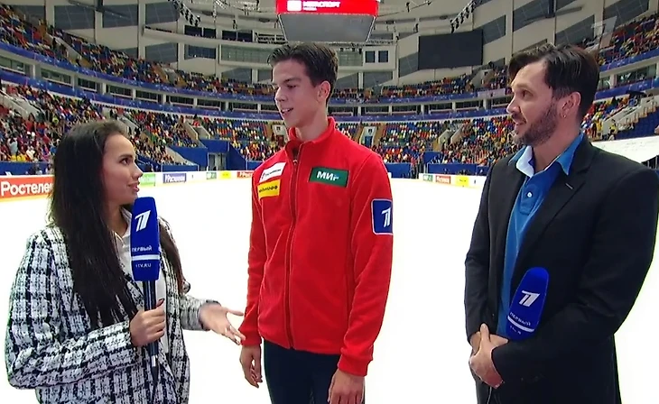 Ребята рассказывают Максиму Транькову (он пока без Алины Загитовой): хотели показать три стиля танцев: современный, классику и вог. Сюжета у танца нет.