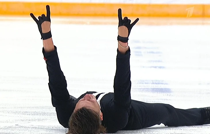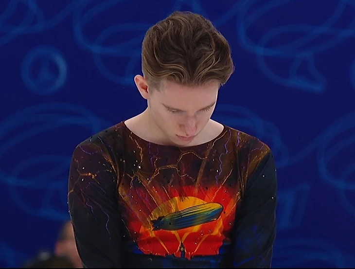 Прыгнул четверной сальхов-двойной тулуп, тройной аксель и четверной тулуп (степ-аут). А еще у него яркий принт с дирижаблем на костюме (Андрей катал под Led Zeppelin).