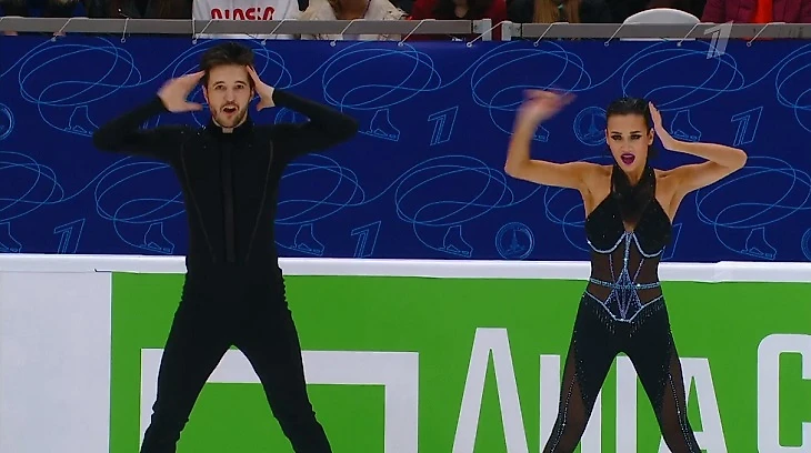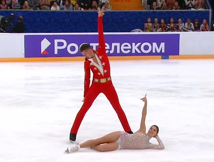Карина Акопова и Никита Рахманин красиво закончили программу выбросом и рокерской "козой" - катали под кавер Come Together от Beatles.