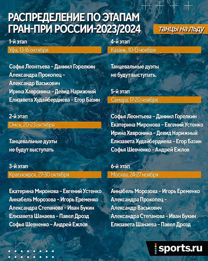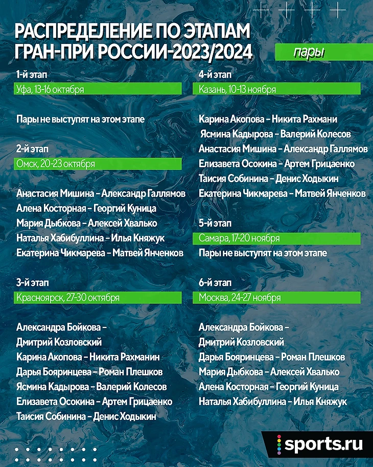 Чемпионы России-2023 Александра Бойкова – Дмитрий Козловский и серебряные призеры того ЧР Анастасия Мишина – Александр Галлямов на этапах не пересекутся: они теперь и тренируются в разных группах.