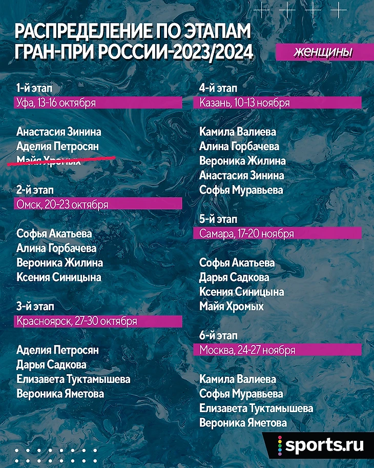 Непонятно, как в распределение попали Алена Косторная и Георгий Куница – они не входили в число кандидатов в сборную, так что по правилам квоты на Гран-при России не получали.