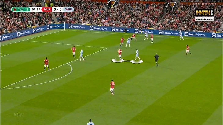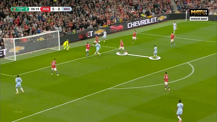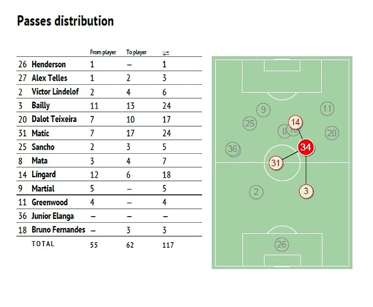 Карта передач Донни показывает, что свою атакующую роль он выполнил хорошо, являясь связующим звеном между обороной(Байи и Матич) и атакой(Лингард). Ключевой пас на Мейсона Гринвуда мог бы стать результативным, попади Мейсон по мячу как следует. Это был НЕтипичный длинный пас для ван де Бека, который привык играть в короткий и средний пас, постоянно двигаясь.