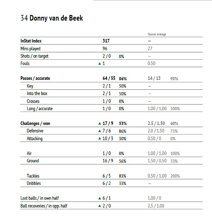 Подводя итог: каждый раз, когда Донни выходит в стартовом составе, его игра подвергается наблюдениям под микроскопом. Тяжело выдавать уверенные матчи, получая полный матч 1 раз в несколько недель. Однако, если ван де Бек хочет реализовать себя в Манчестер Юнайтед, ему предстоит научиться работать в эти ключевые моменты. Донни и Диогу Дало выглядели двумя лучиками света в матче Кубка Лиги, как и Джейдон Санчо, набирающий обороты.