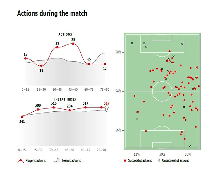 В защите все в цифрах тоже выглядит неплохо: 6/7 единоборств в обороне выиграно и 5/6 отборов. Однако гол, пропущенный МЮ является в значительной степени виной голландца: он оставил за спиной Лансини, и не оглянулся ни разу, чтобы проконтролировать зону. Это - одна из основных обязанностей центрального полузащитника, страхующего оборону.