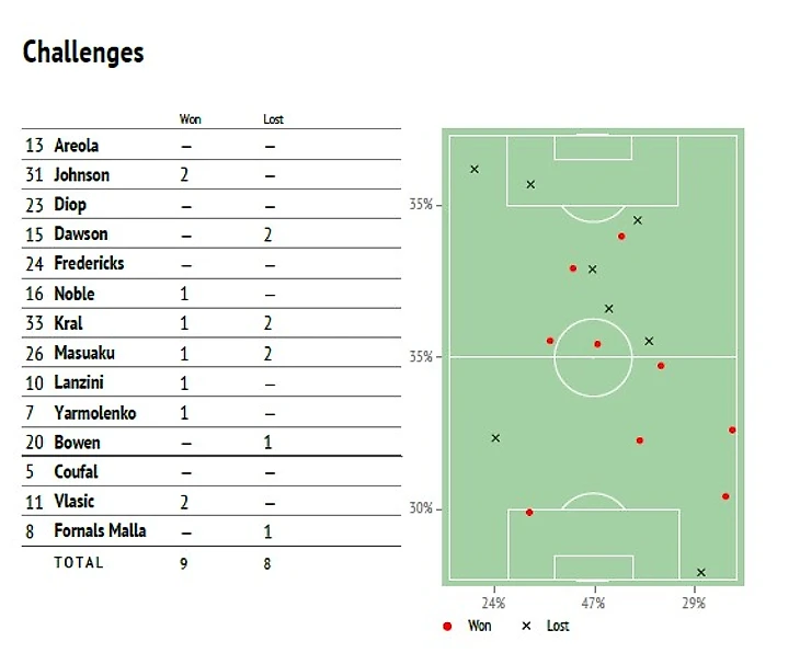 Проигранные единоборства ван де Бека находятся погранично-опасных зонах: в опасной близости около своих ворот и в финальной трети поля. Т.е. в решающие моменты голландец терял мяч для своей команды, имея в оппонентах не самых сильных, но крепких соперников(Крал, Масуаку, Боуэн).